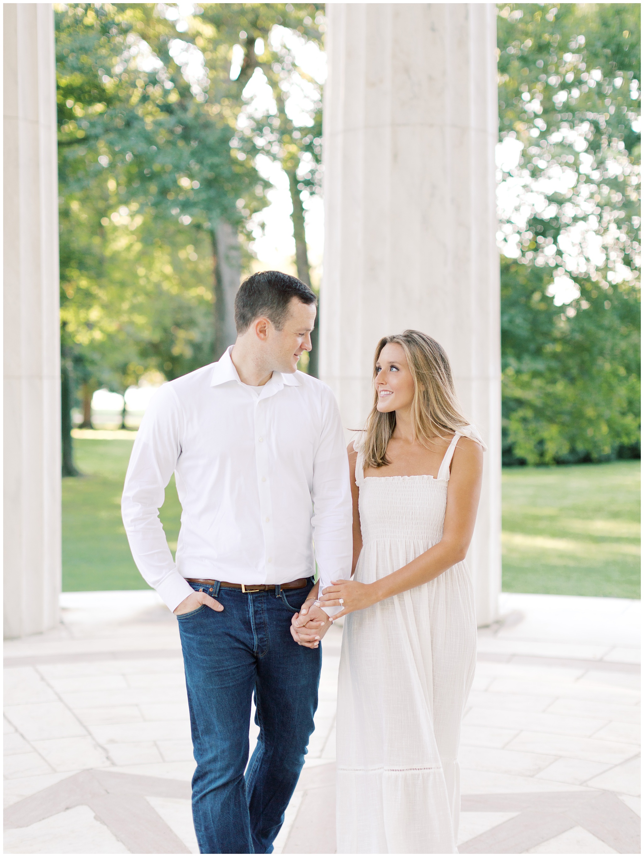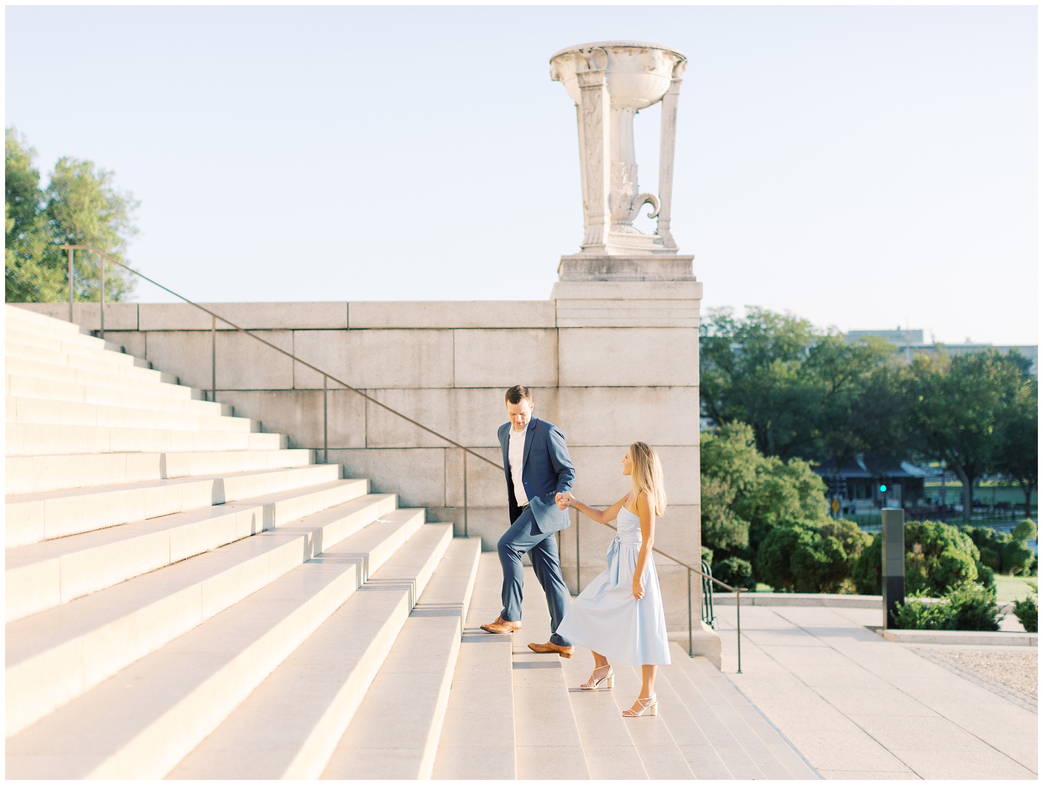 Elizabeth and Cullen’s iconic city engagement session in the heart of Washington DC began bright and early at the foot of the Lincoln Memorial. As the sun began to rise slowly across the reflecting pool, this chic DC couple twirled, kissed, and cheers’d their way through a magical summer morning!