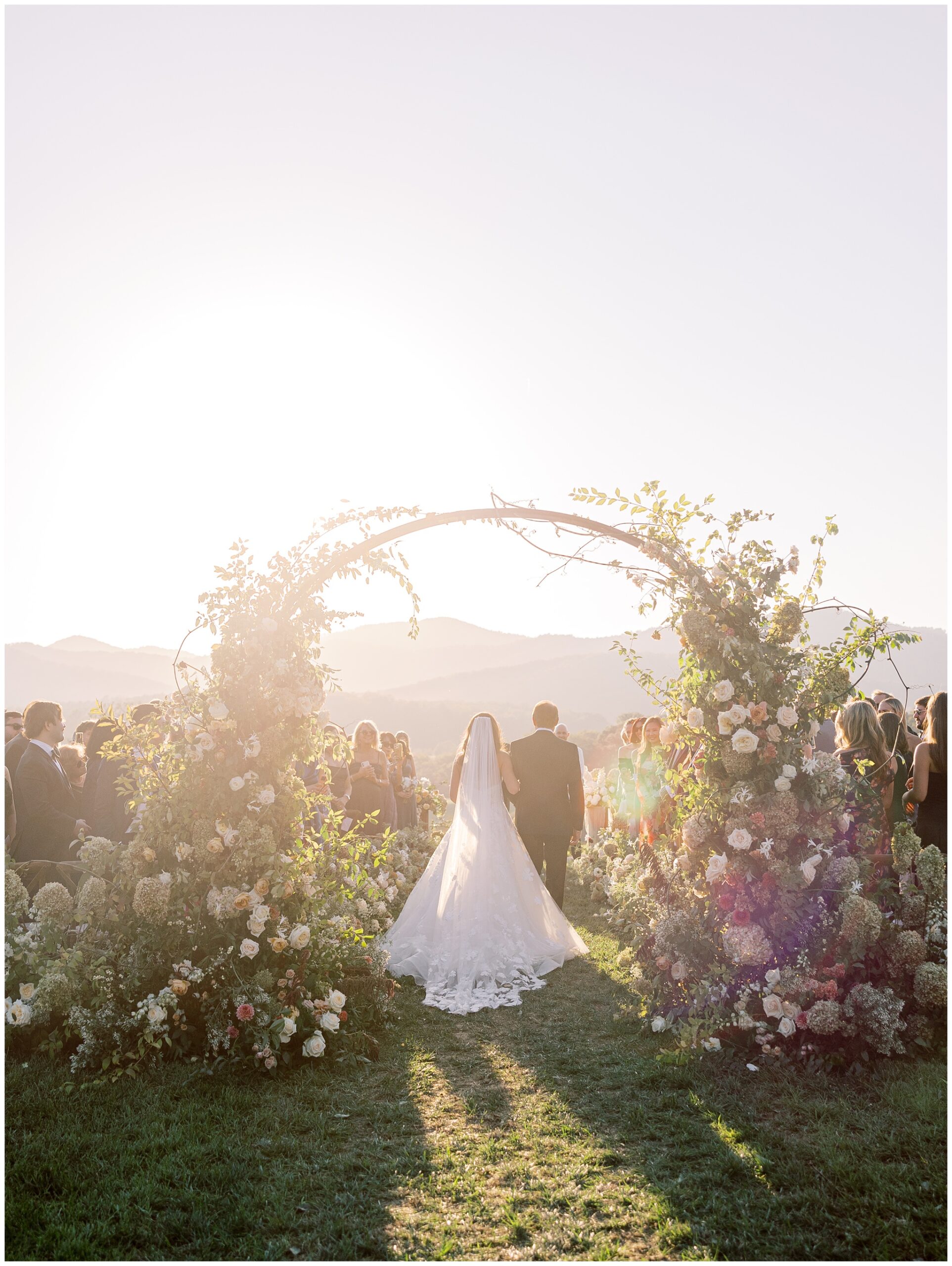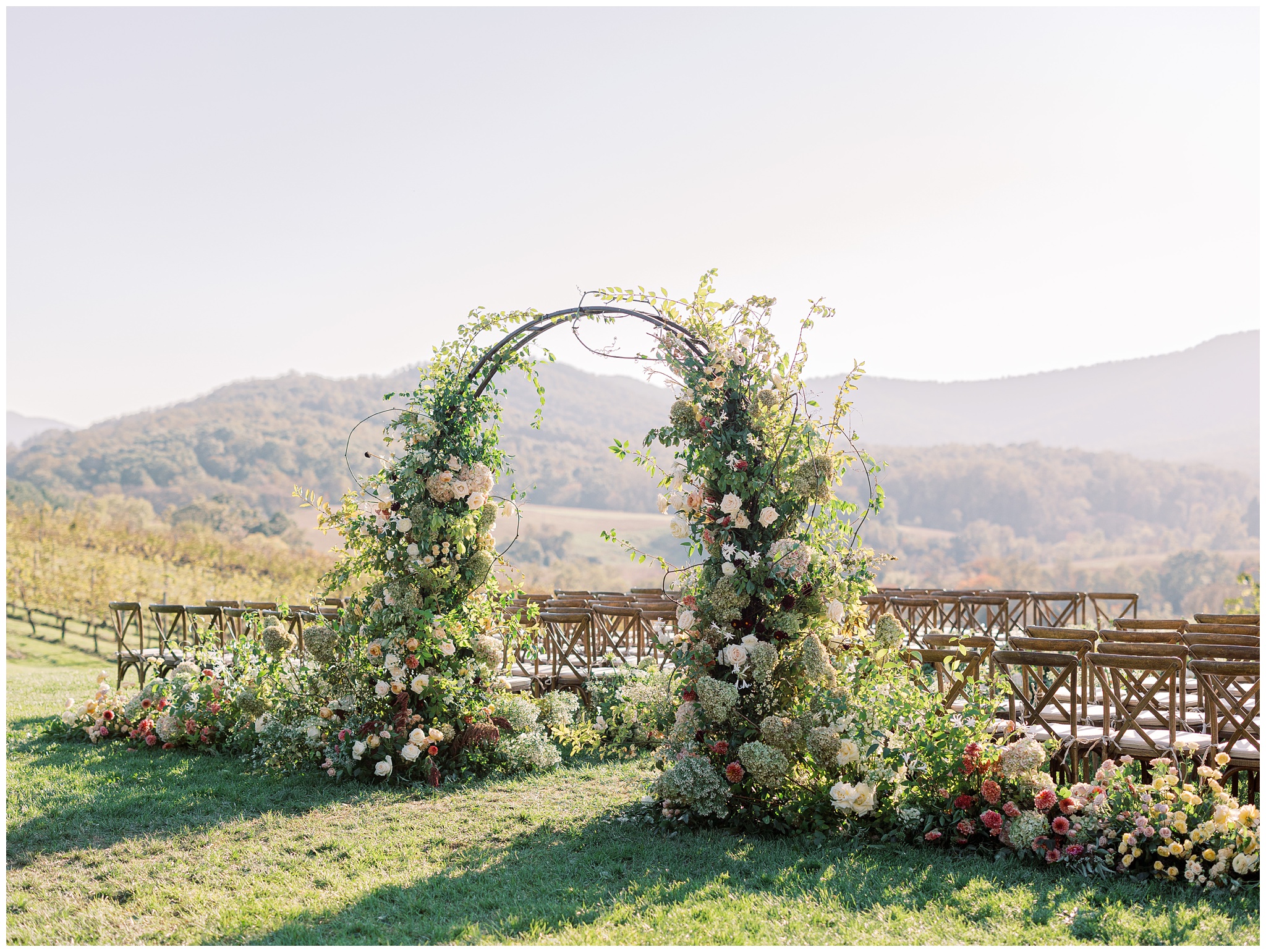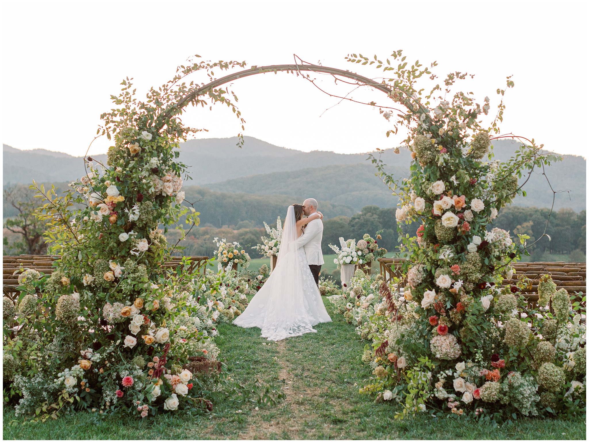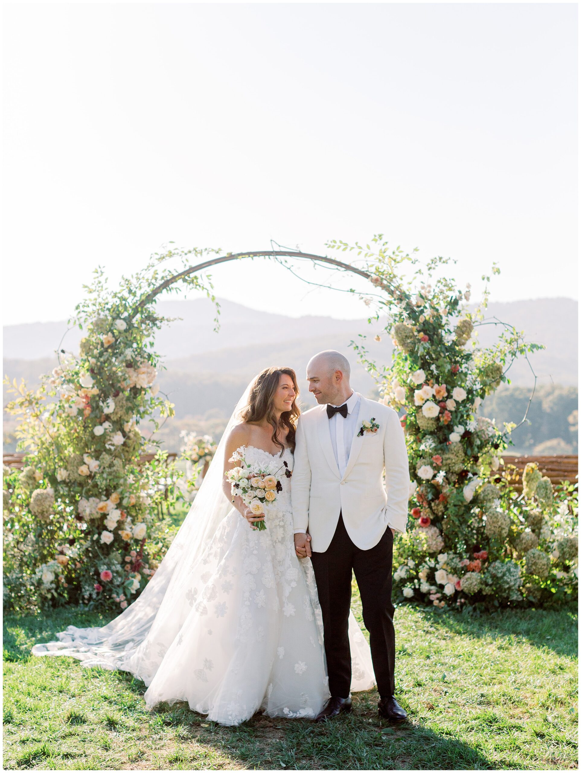 When the beauty is jaw dropping, the joy is palpable, and the energy is contagious. Brittany and Callen’s Pippin Hill wedding was an epic celebration with over-the-top florals, impeccable details, dripping sunlight, and panoramic views of the Blue Ridge mountains. Brittany envisioned a day that was fun, elegant, romantic, and lush. A day that was overflowing with florals with an effortless “falling into a fairytale love story” kind of vibe. And boy, did the day deliver! From planes writing messages in the sky to a dramatic entrance arbor, oyster shuckers, and a thoughtfully curated bookshelf escort wall, there was no shortage of romance or entertainment for guests.