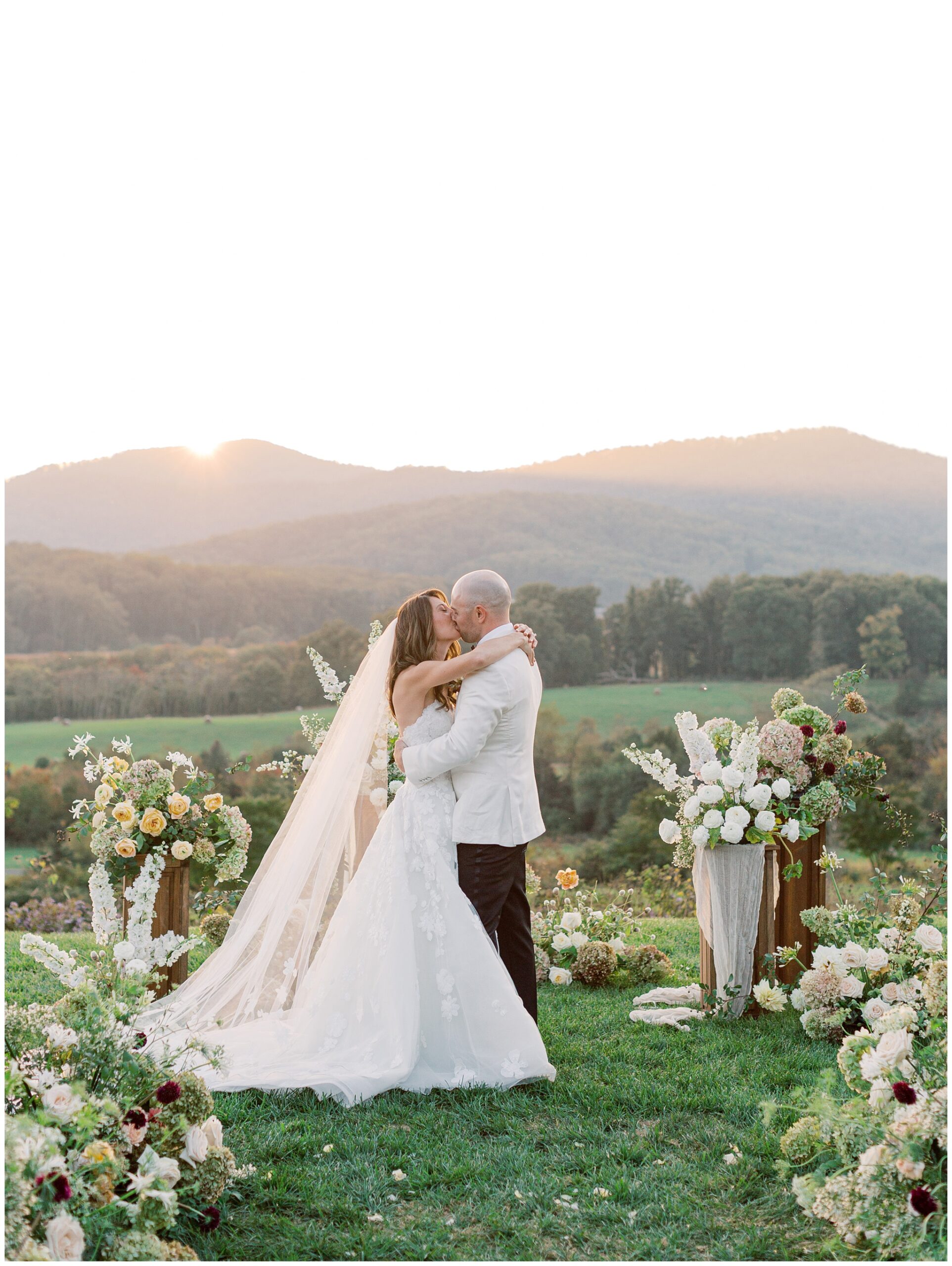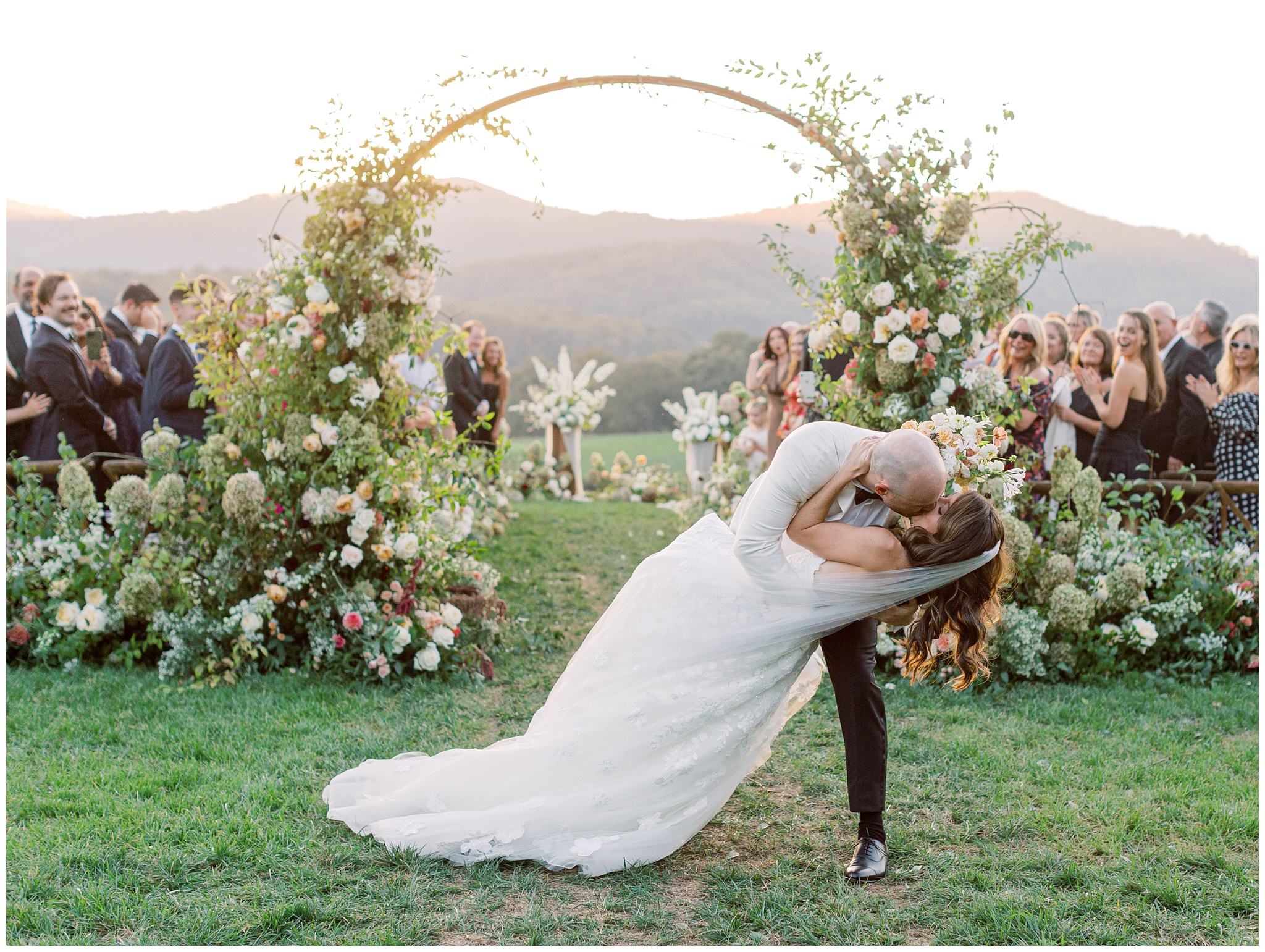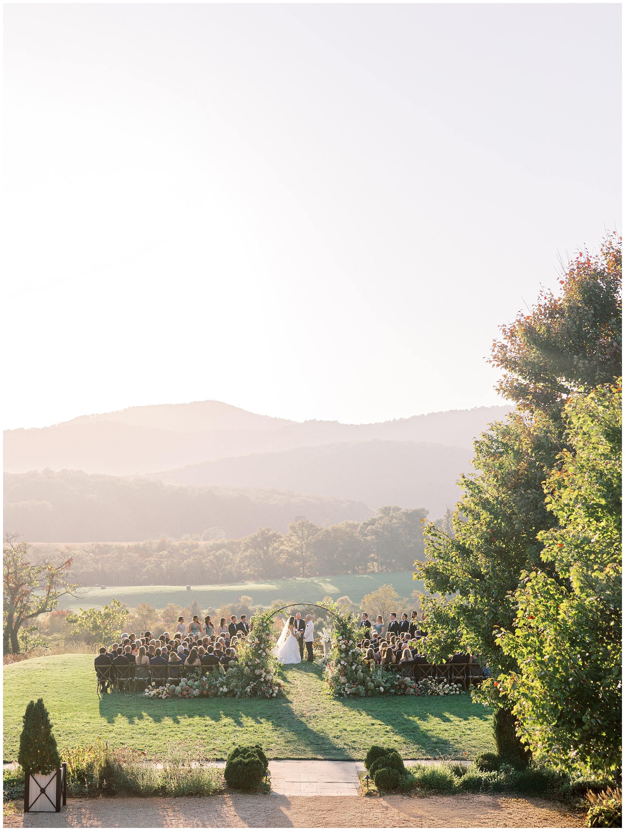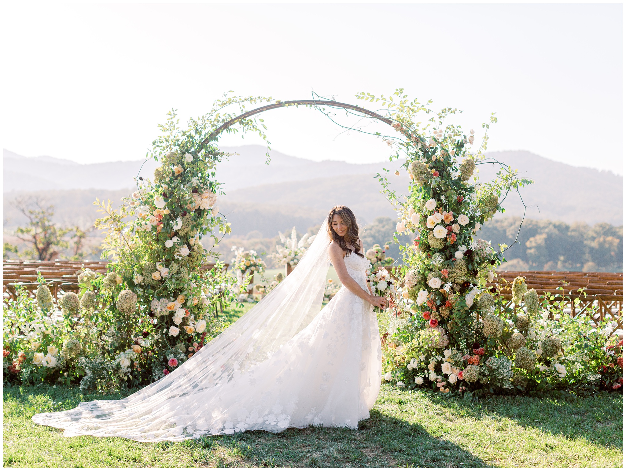 When the beauty is jaw dropping, the joy is palpable, and the energy is contagious. Brittany and Callen’s Pippin Hill wedding was an epic celebration with over-the-top florals, impeccable details, dripping sunlight, and panoramic views of the Blue Ridge mountains. Brittany envisioned a day that was fun, elegant, romantic, and lush. A day that was overflowing with florals with an effortless “falling into a fairytale love story” kind of vibe. And boy, did the day deliver! From planes writing messages in the sky to a dramatic entrance arbor, oyster shuckers, and a thoughtfully curated bookshelf escort wall, there was no shortage of romance or entertainment for guests.