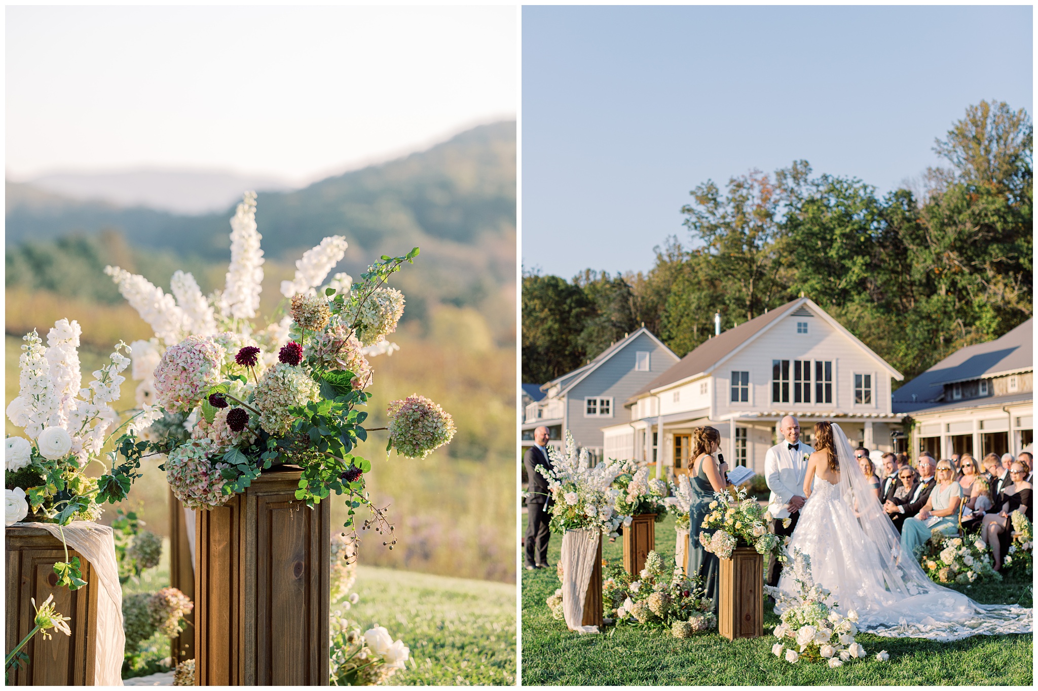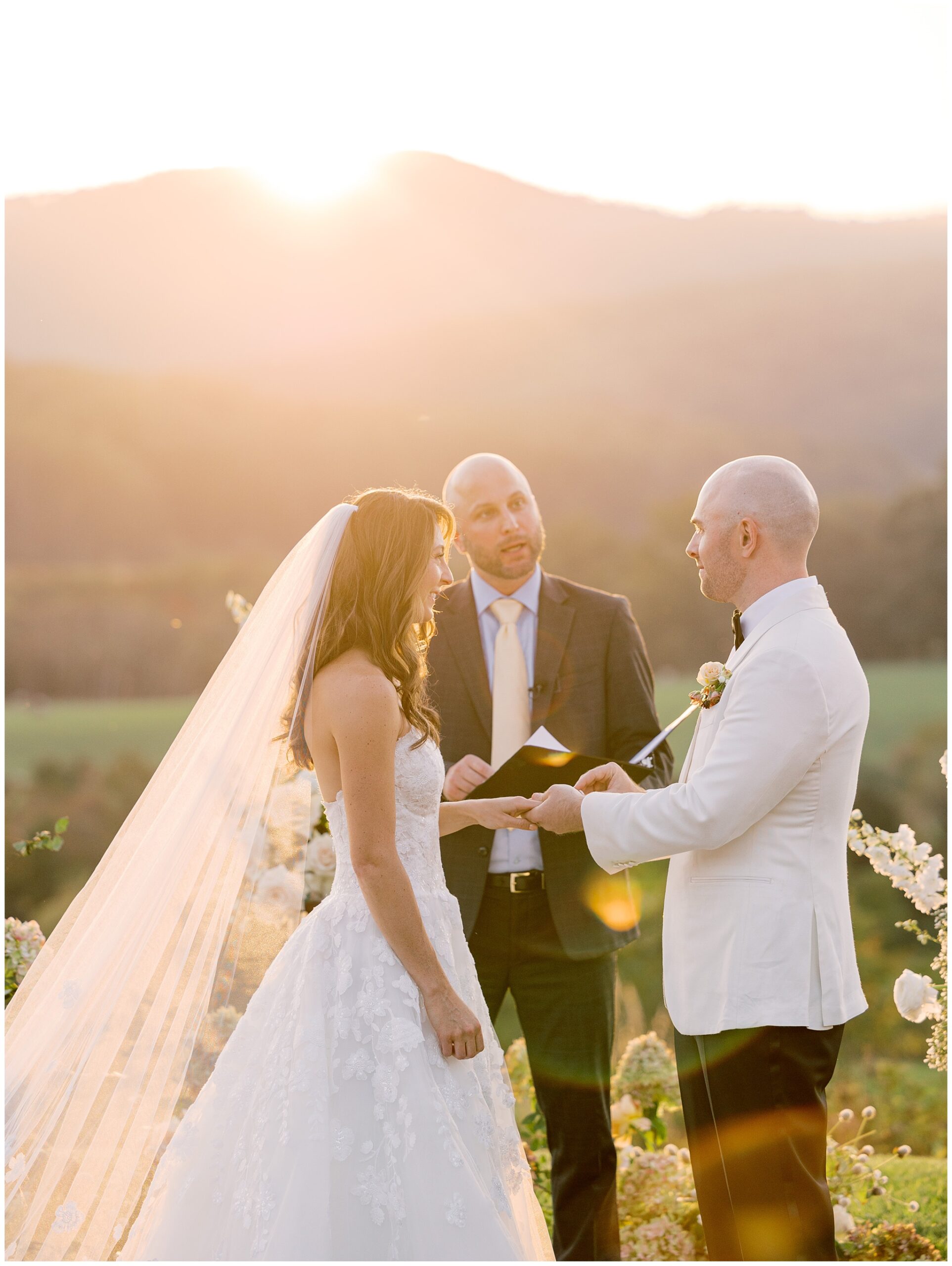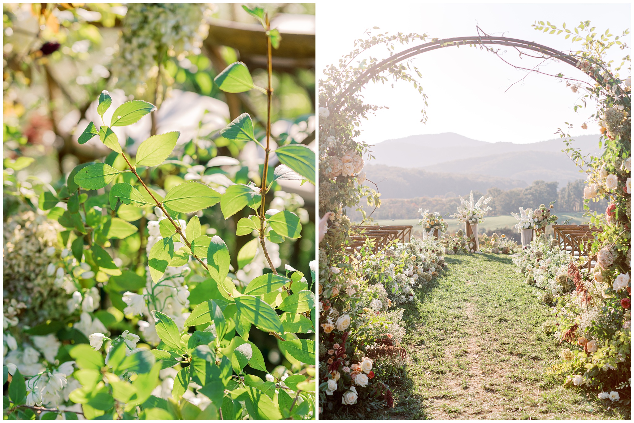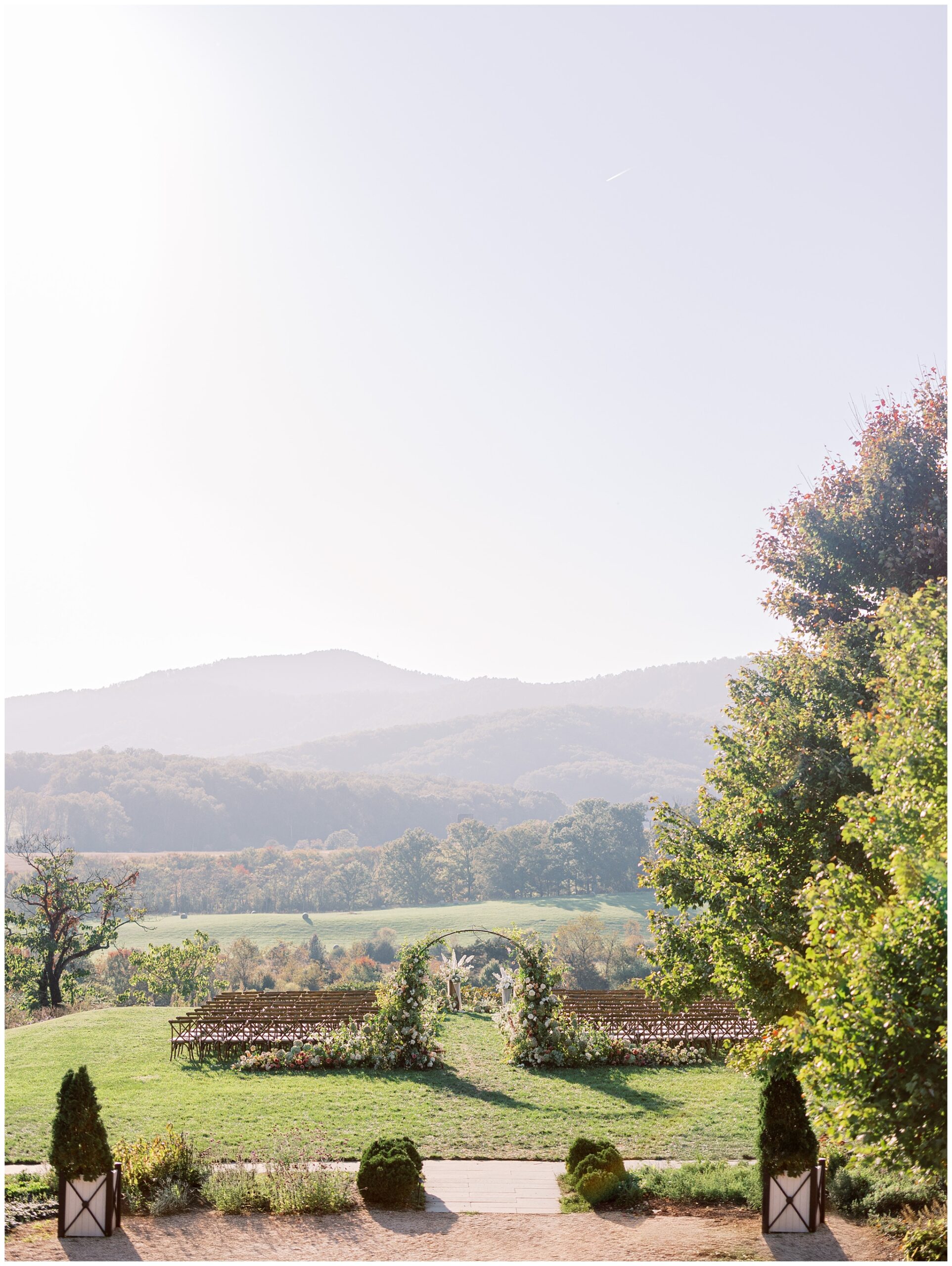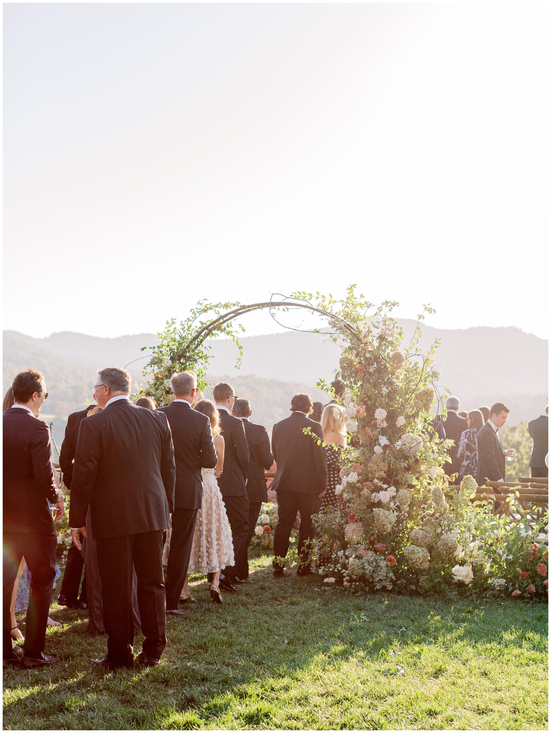 When the beauty is jaw dropping, the joy is palpable, and the energy is contagious. Brittany and Callen’s Pippin Hill wedding was an epic celebration with over-the-top florals, impeccable details, dripping sunlight, and panoramic views of the Blue Ridge mountains. Brittany envisioned a day that was fun, elegant, romantic, and lush. A day that was overflowing with florals with an effortless “falling into a fairytale love story” kind of vibe. And boy, did the day deliver! From planes writing messages in the sky to a dramatic entrance arbor, oyster shuckers, and a thoughtfully curated bookshelf escort wall, there was no shortage of romance or entertainment for guests.