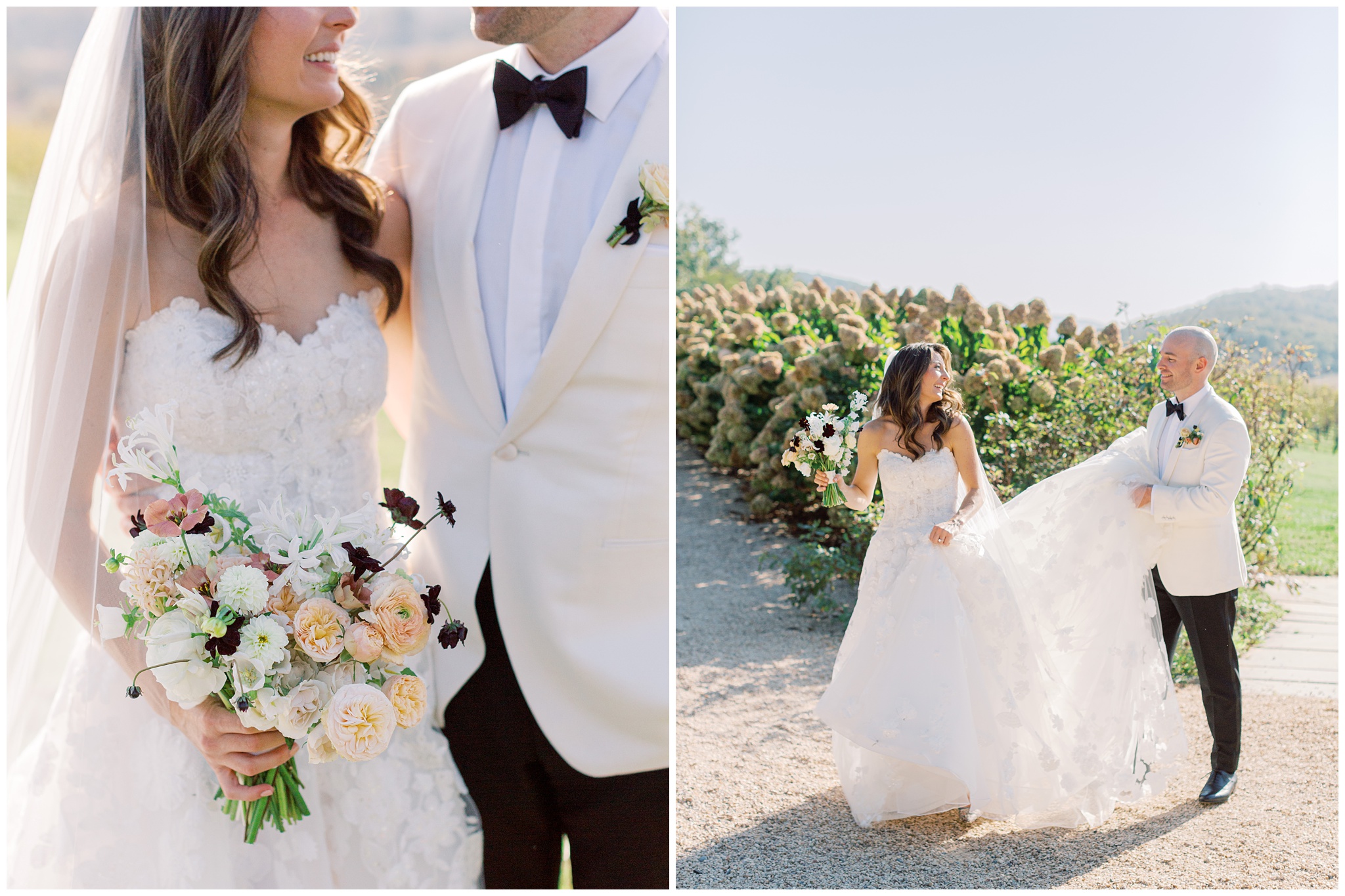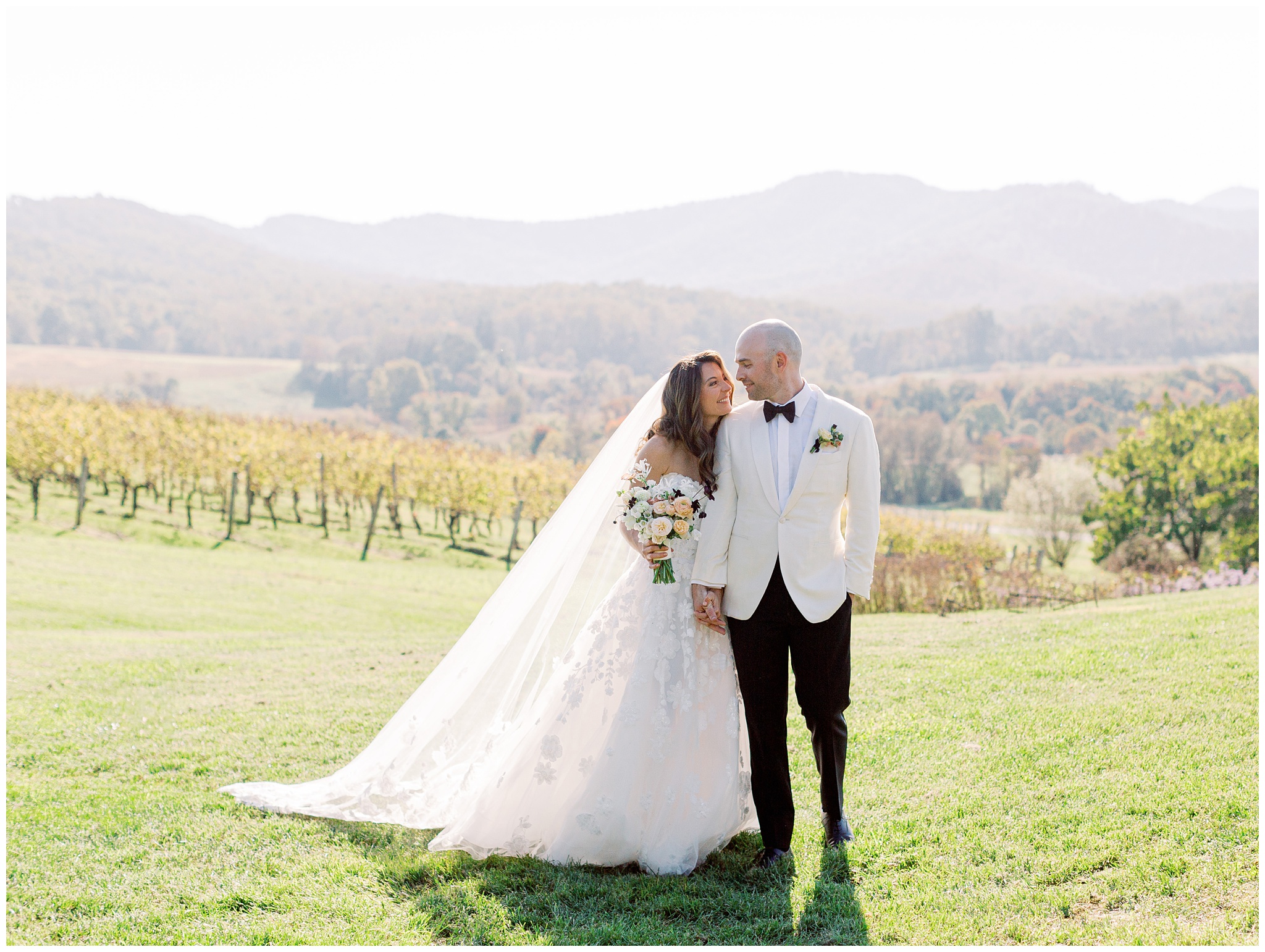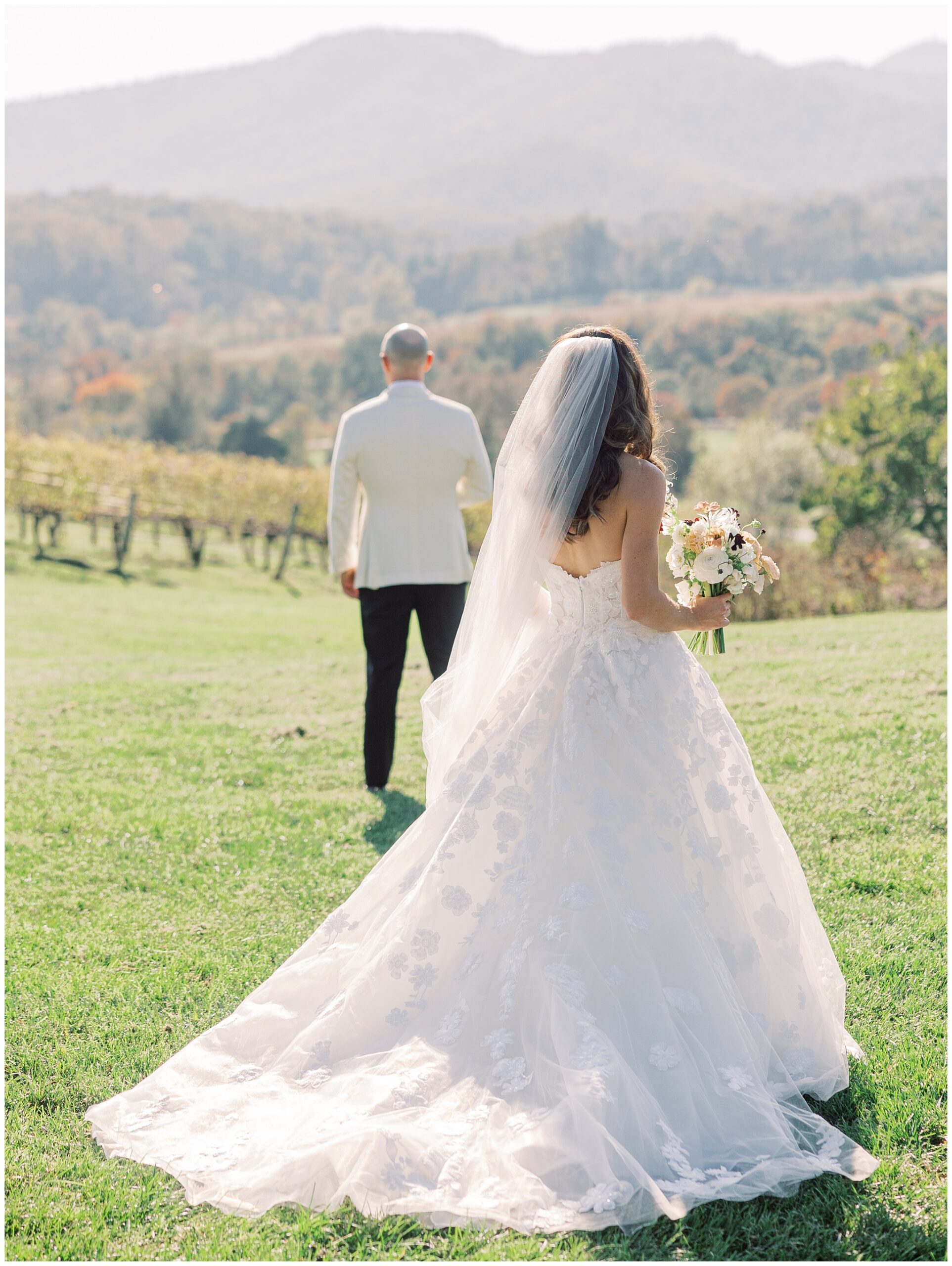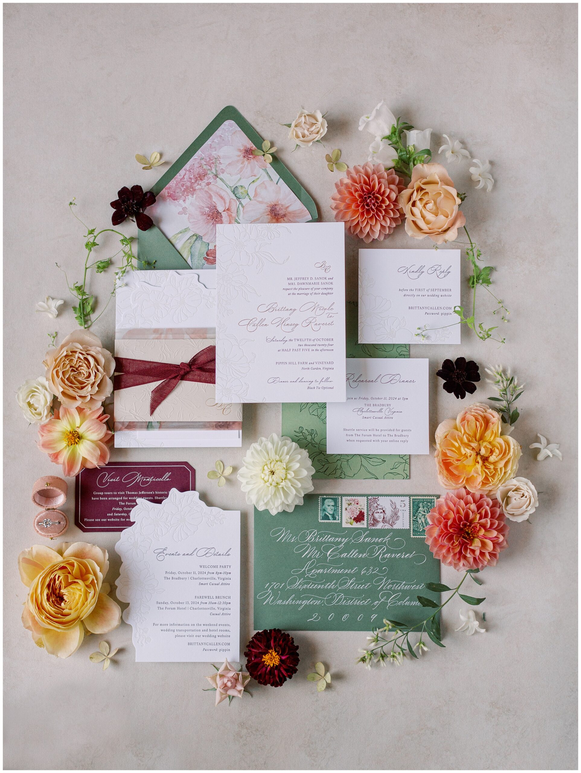 When the beauty is jaw dropping, the joy is palpable, and the energy is contagious. Brittany and Callen’s Pippin Hill wedding was an epic celebration with over-the-top florals, impeccable details, dripping sunlight, and panoramic views of the Blue Ridge mountains. Brittany envisioned a day that was fun, elegant, romantic, and lush. A day that was overflowing with florals with an effortless “falling into a fairytale love story” kind of vibe. And boy, did the day deliver! From planes writing messages in the sky to a dramatic entrance arbor, oyster shuckers, and a thoughtfully curated bookshelf escort wall, there was no shortage of romance or entertainment for guests.