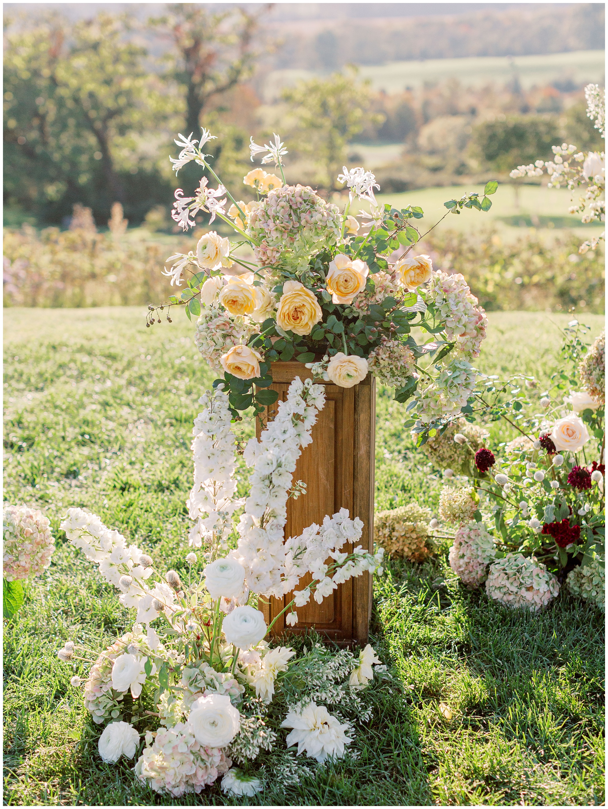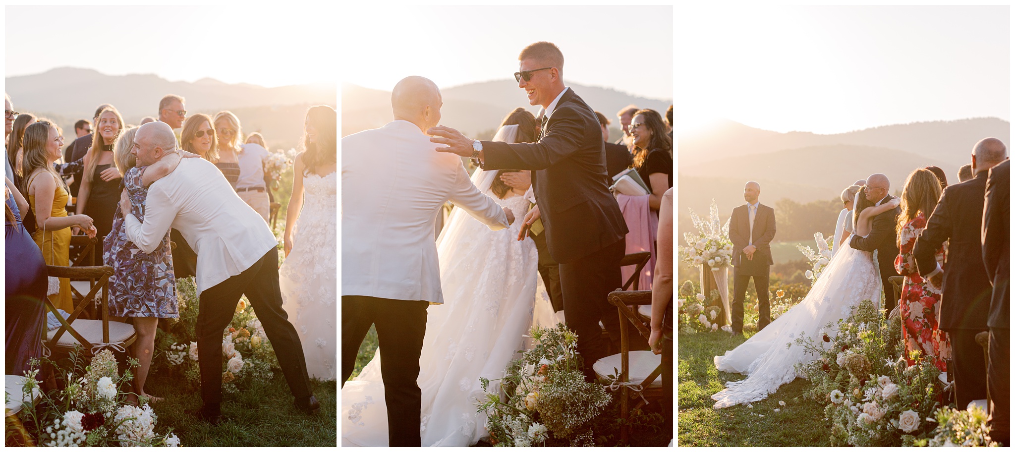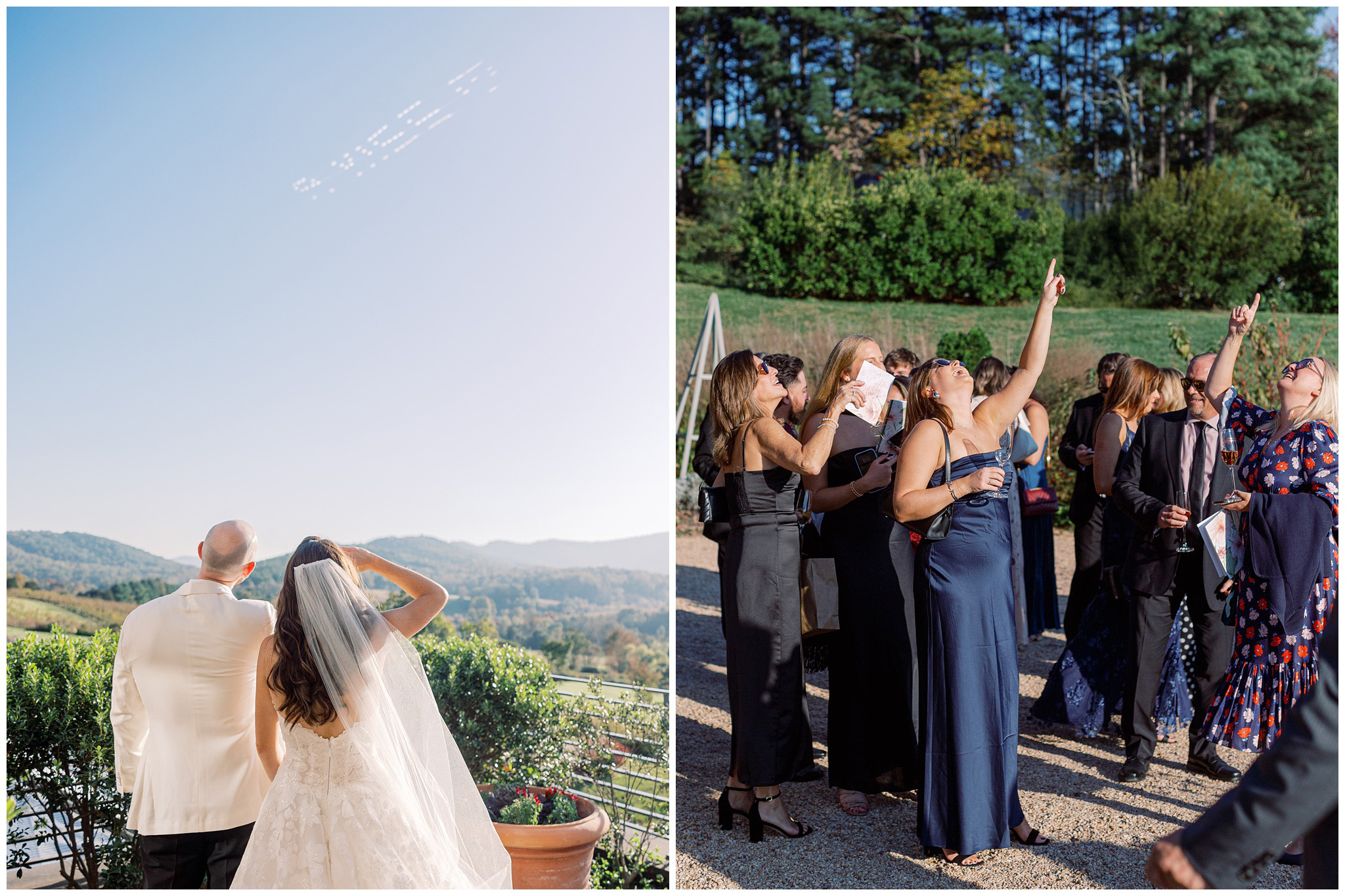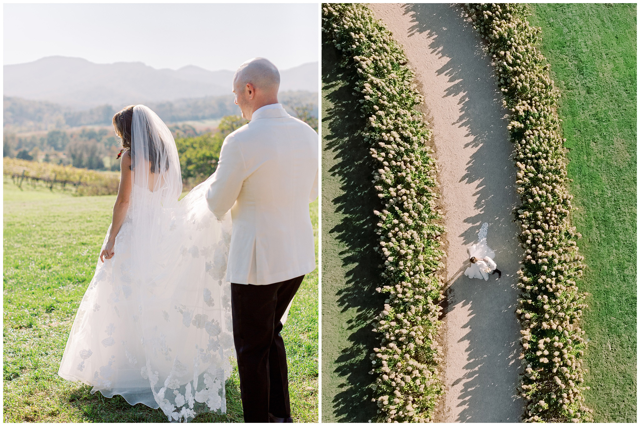 When the beauty is jaw dropping, the joy is palpable, and the energy is contagious. Brittany and Callen’s Pippin Hill wedding was an epic celebration with over-the-top florals, impeccable details, dripping sunlight, and panoramic views of the Blue Ridge mountains. Brittany envisioned a day that was fun, elegant, romantic, and lush. A day that was overflowing with florals with an effortless “falling into a fairytale love story” kind of vibe. And boy, did the day deliver! From planes writing messages in the sky to a dramatic entrance arbor, oyster shuckers, and a thoughtfully curated bookshelf escort wall, there was no shortage of romance or entertainment for guests.