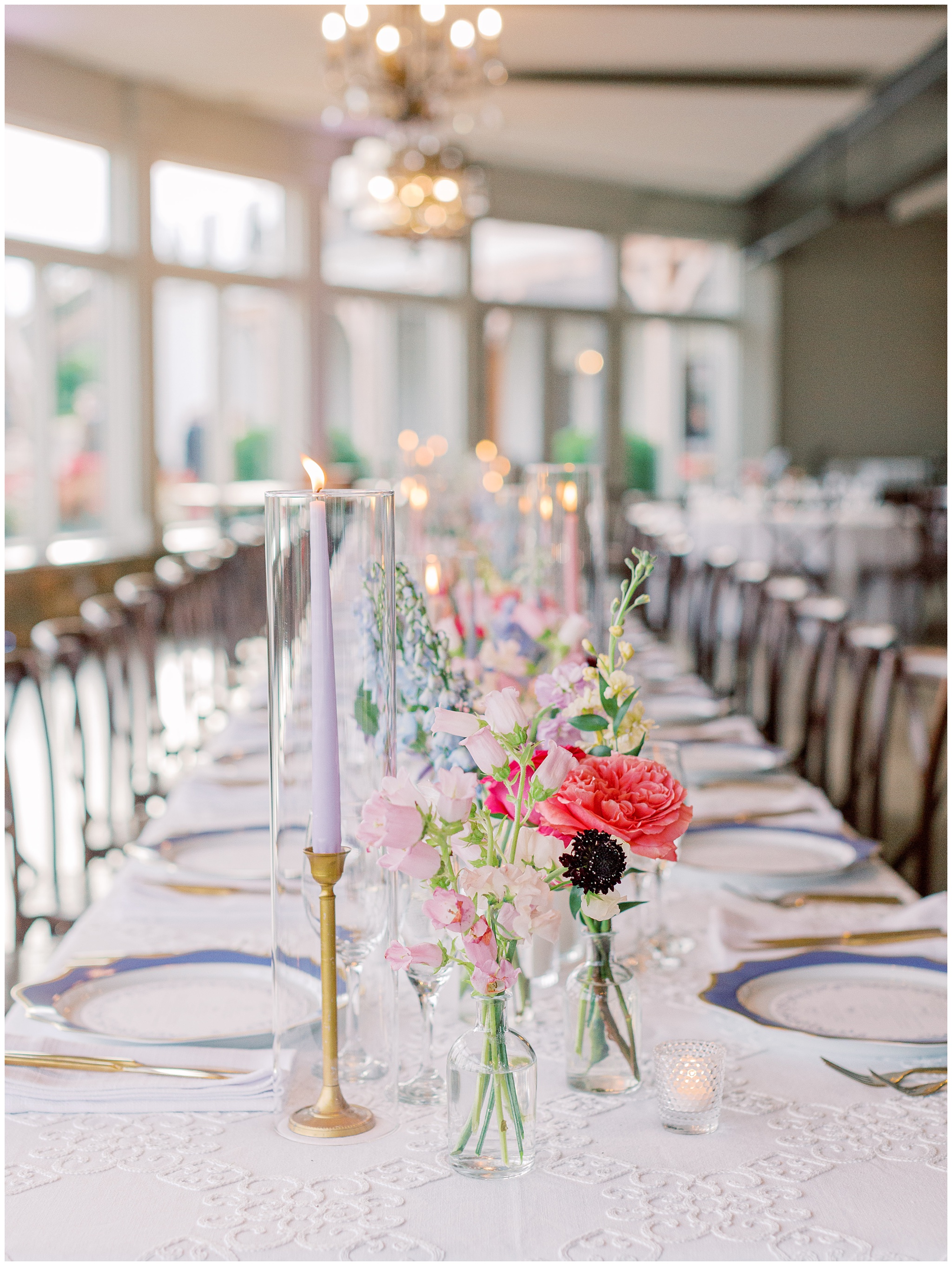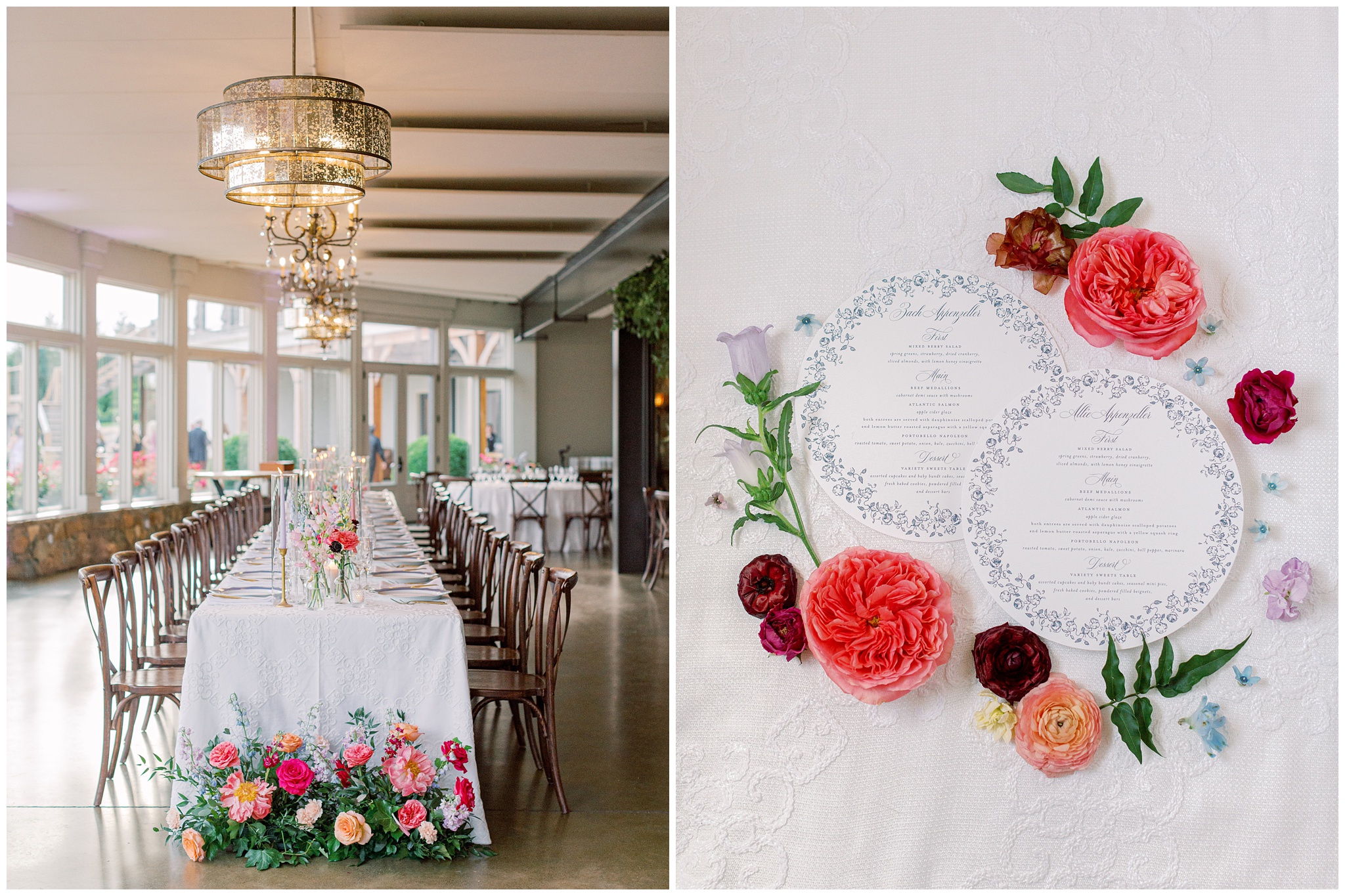 Allie and Zach’s spring wedding at Stone Tower Winery was a colorful, black tie affair with bold hues and natural textiles. Their color palette ranged from vibrant corals and cheerful pinks to soft purples and dreamy blues, creating a kaleidoscope of beauty. From the lush florals and mismatched bridesmaids’ dresses to the thoughtfully chosen flatware and décor, guests were greeted with pops of color at every turn.